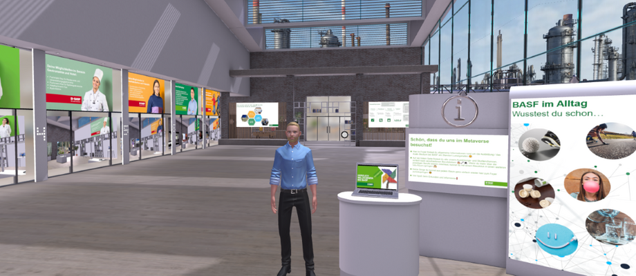 Im Metaverse-Raum von BASF erhältst du umfassende Einblicke in deren Ausbildungsberufe, ihre dualen Studiengänge sowie in das Programm Start in den Beruf. Du kannst dich in dem Raum frei bewegen, Informationen interaktiv entdecken und dir einen realitätsnahen Eindruck davon verschaffen, wie vielfältig die Ausbildung bei BASF ist.